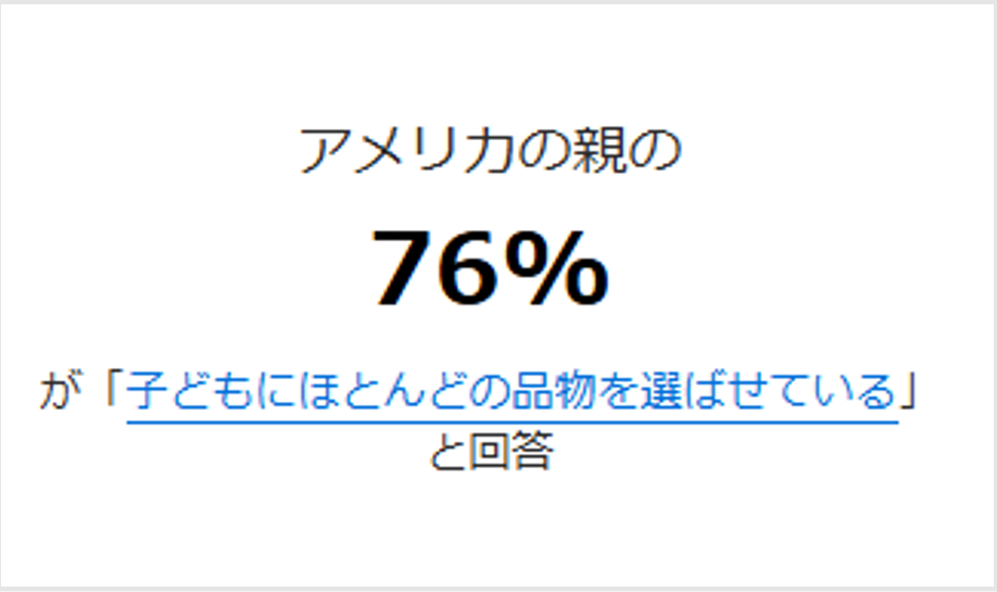 アメリカの就学前から高校生の子どもを持つ親を対象とした調査では、「子どもにほとんどの品物を選ばせている」と答えた親は76%に及び、「選ばせない」とした11%の約7倍となりました。