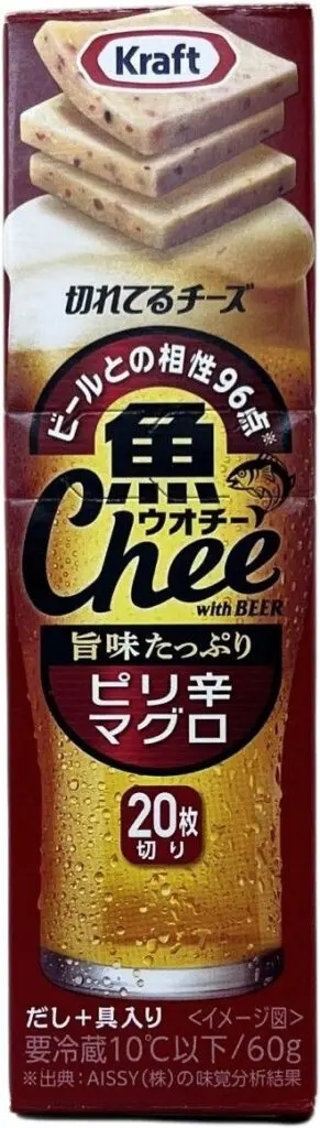 チーズとシーフードの旨味がたっぷり入った、ビールにぴったりの一口サイズのおつまみ。ピリ辛マグロ味は、チーズには珍しいフレーバー。且つ、小さなマグロが入っているので、なおさら珍しい。メーカーによると、「噛めば噛むほど味が出る」という。