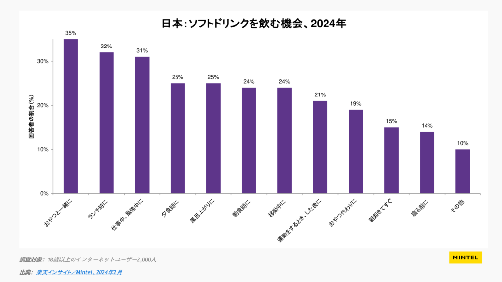 日本の消費者はおやつ、ランチ、仕事中、夕食時など、さまざまなシーンでソフトドリンクを楽しんでいます。また、世界的に食事の際にアルコール以外の選択肢を探す消費者が多く、ミンテルの行った調査によると日本の消費者の3割が「食事に合う」ことがノンアルコール飲料の購入の動機になると考えています。