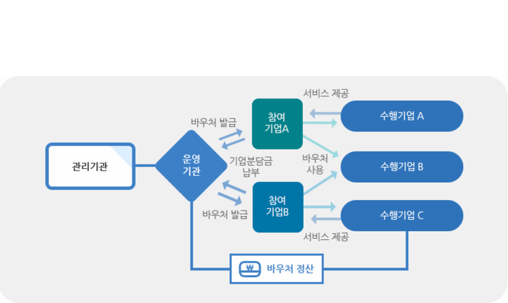 - 부여된 바우처 총 한도에 맞춰, 정해진 비율의 기업 자부담금을 가상계좌에 먼저 납부합니다.