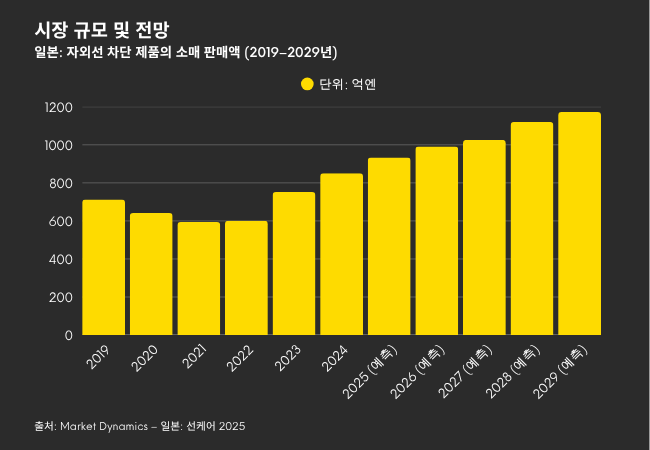 시장 동향의 참고 지표로서 일본의 사례를 보면, 2024년 일본 선케어 소매 시장 규모는 8,500억 엔(한화 약 7.8조 원)에 달했으며, 그중 자외선 차단제가 8,360억 엔을 차지했습니다. 사용 빈도 증가와 여름이 길어지는 기후 변화가 성장을 견인하고 있습니다. 일본 시장은 2025년 9,340억 엔, 2029년에는 1조 1,720억 엔에 이를 것으로 전망됩니다.