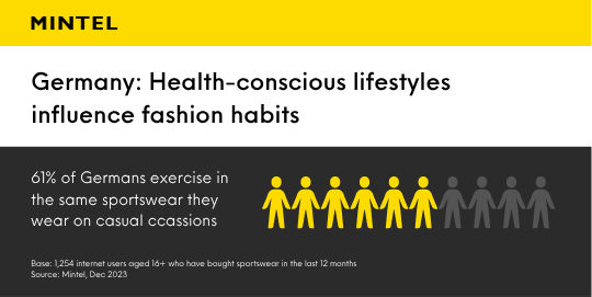 건강 및 웰니스 트렌드가 소비자 습관에 영향을 미치면서 스포츠웨어 수요가 증가하고 있으며, 이는 운동복을 넘어 일상복으로 확장되고 있습니다. 독일에서는 스포츠용품 구매자 10명 중 6명이 스포츠웨어를 일상복으로 착용합니다. 이러한 변화는 브랜드에게 활동적이고 건강을 중시하는 라이프스타일에 부합하는 다재다능하고 스타일리시한 제품을 만들 기회를 제공합니다.
