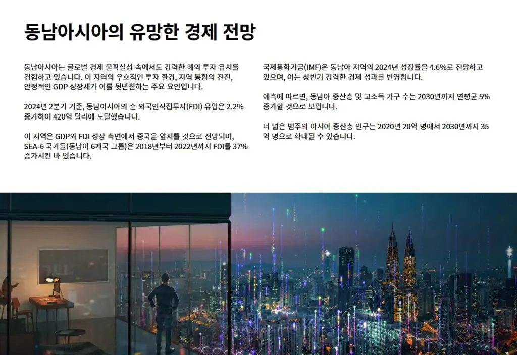 동남아시아는 전 세계적인 경제 불확실성 속에서도 강한 외국인 투자 유입을 경험하고 있습니다. 이 지역의 우호적인 투자 환경, 지역 통합의 진전, 안정적인 GDP 성장이 이러한 흐름을 뒷받침하는 주요 요인입니다.