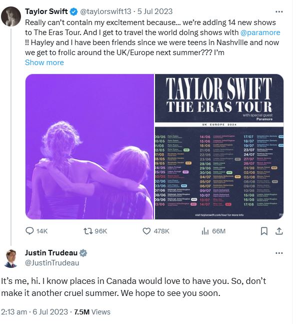 캐나다 총리 저스틴 트뤼도가 테일러 스위프트의 추가적인 국제 투어 일정 발표에 응답하고 있다.