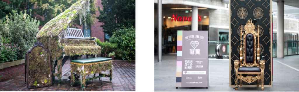 - 리버풀은 일주일 동안 ‘테일러 타운’으로 변신했습니다. 방문객들이 사진을 찍어 소셜 미디어에 올릴 수 있는 11개의 설치물이 있는 테마 아트 트레일과 스위프트 테마 컵케이크, 우정 팔찌, 업사이클 데님 만들기 등의 활동을 제공하는 워크숍이 포함되었습니다.