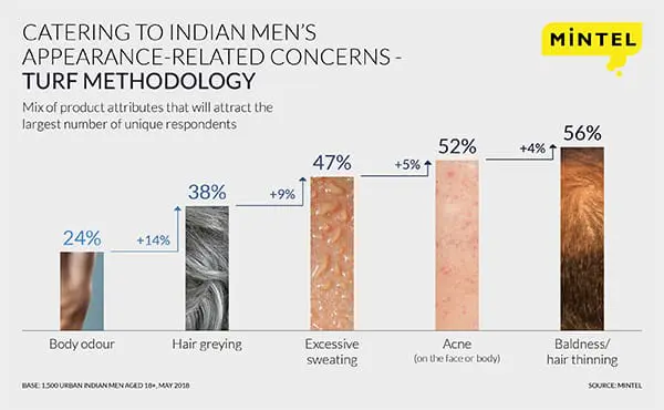 In terms of targeting Indian men with the right grooming products, Mintel research, using the Total Unduplicated Research & Frequency (TURF) methodology**, reveals that men’s grooming products that collectively cater to concerns of body odour, hair greying, excessive sweating, acne, and baldness/hair thinning appeal to 56% of Indian men.