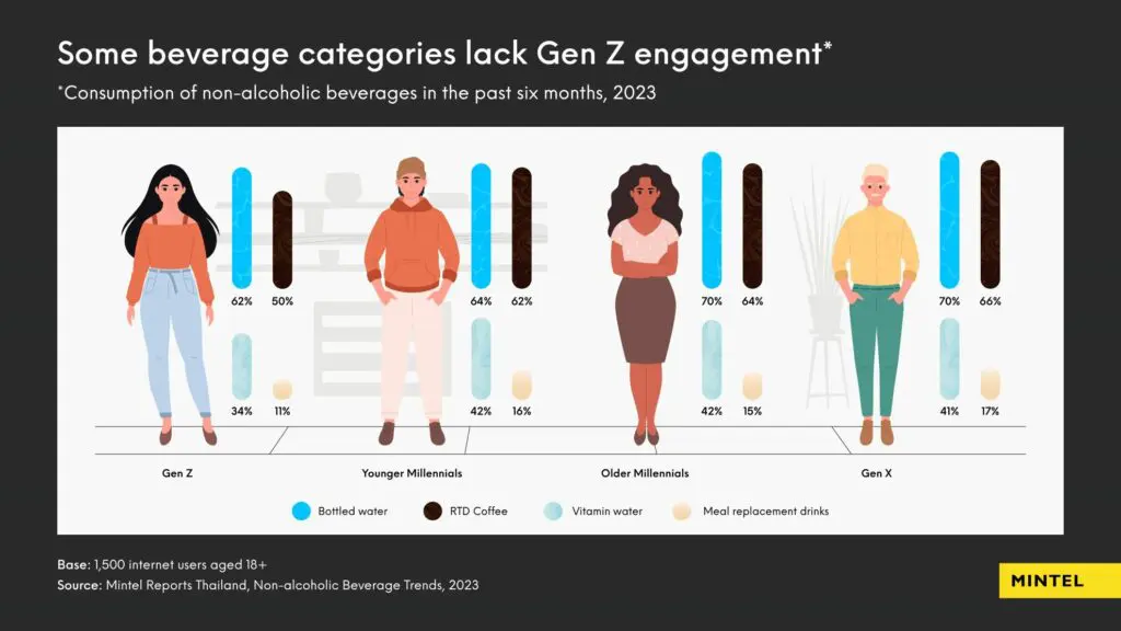 Although Gen Z represents the largest consumer segment for non-alcoholic beverages in Thailand, their consumption lags behind other age groups in certain categories such as bottled water, ready-to-drink (RTD) coffee, vitamin water and meal replacement drinks (e.g. protein-rich shakes). Mintel research indicates a significant untapped potential for brands in the Gen Z market.