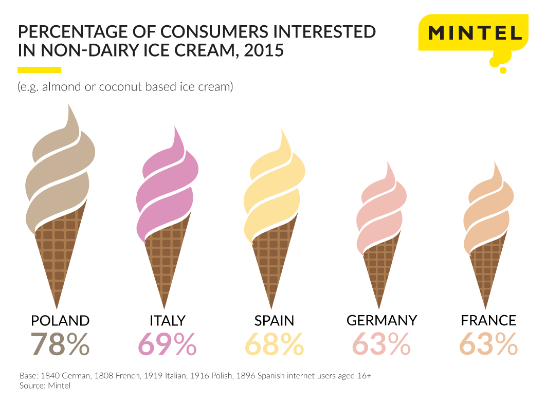 The high demand for non-dairy ice cream is also evident in other key European countries, with interest signaled by 78% of Polish, 69% of Italian, 68% of Spanish and 63% of French consumers. What’s more, the willingness to spend more on such alternatives seems to be pronounced across Europe, with 27% of consumer in Poland, 21% in Italy, 25% in Spain, and 18% in France agreeing they would pay a premium price for these options.